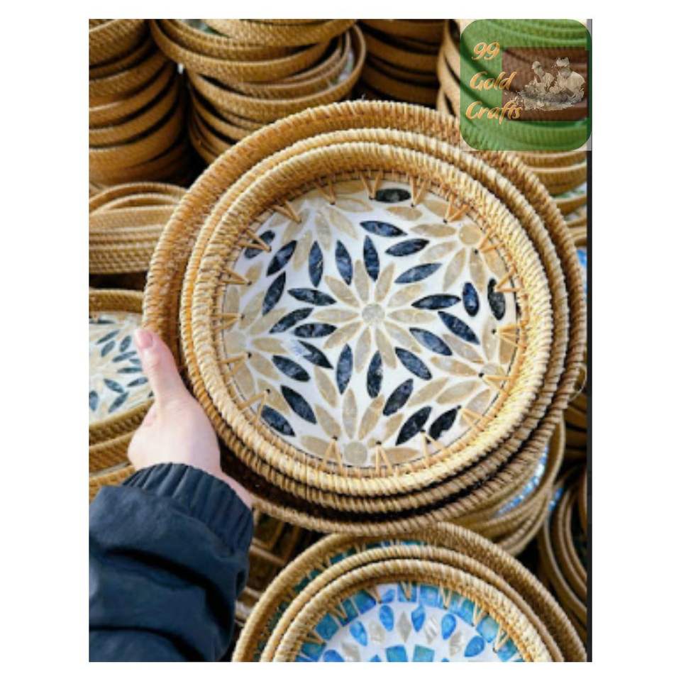 ถาดหวายทรงกลมพร้อมที่จับสำหรับตกแต่งโต๊ะกาแฟในห้องนั่งเล่น