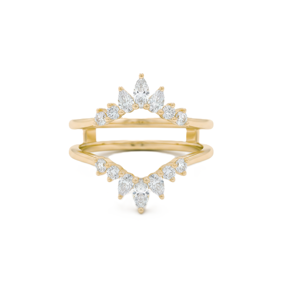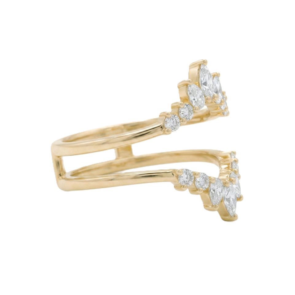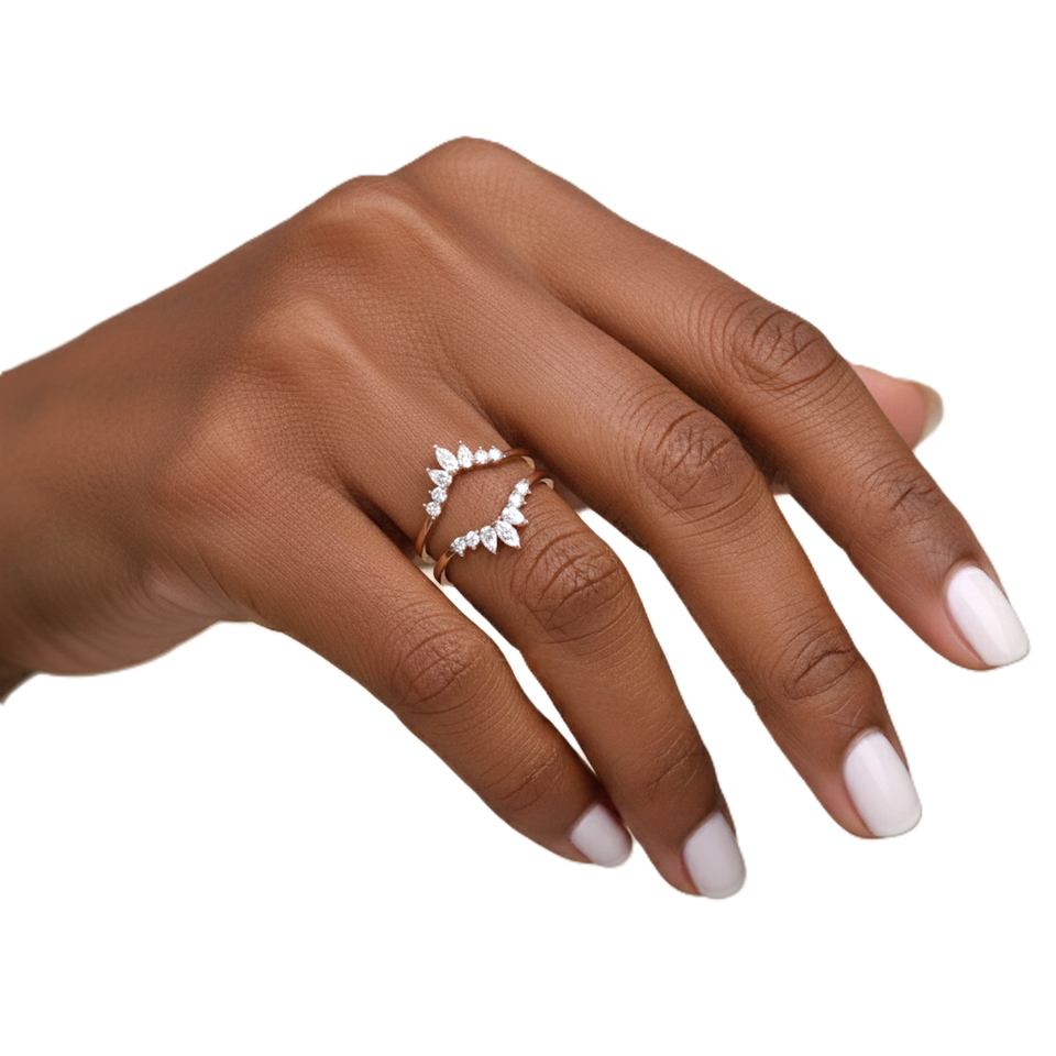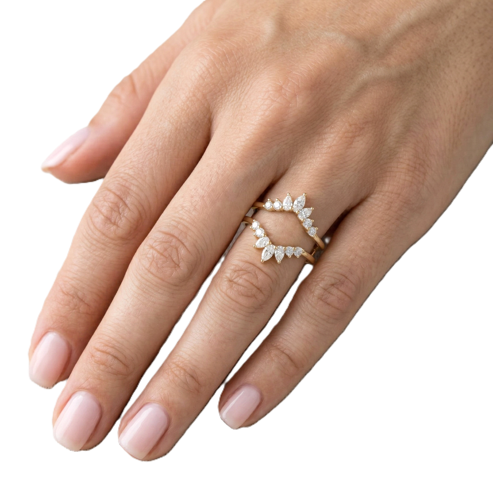 แหวนแต่งงานแบบซ้อนกัน ดีไซน์เชฟรอนโค้ง ทำจากทองคำแท้ 18K ประดับเพชรทรงมาร์คีส์และทรงกลมจากแล็บ พร้อมเพชร DEF Color VS VVS Clarity