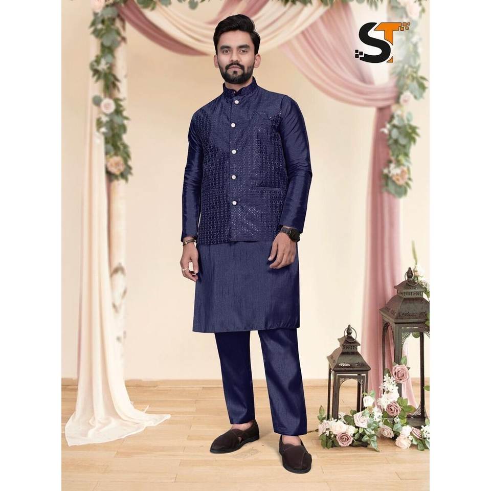 DESIGNER BANGLORI SILK MENS KURTA PANT WITH EMBROIDERY SEQUENCE WORK KOTI NAVY BLUE