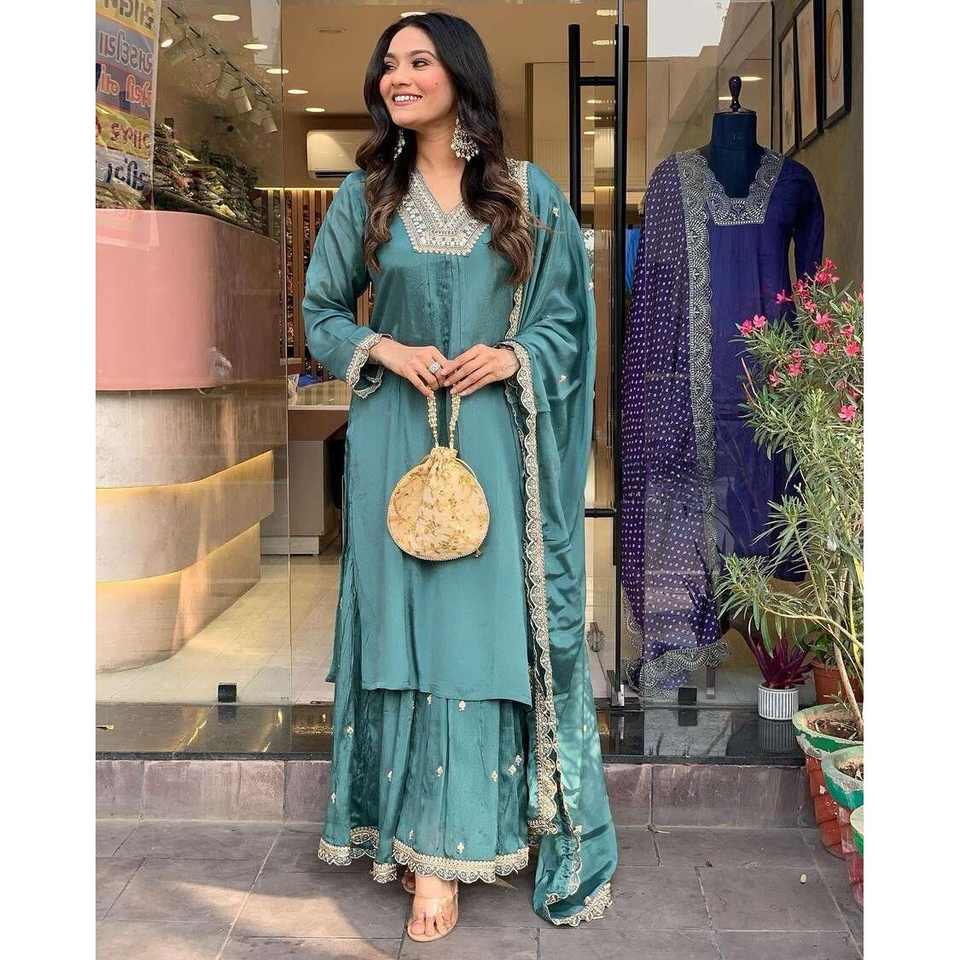 เสื้อลูกไม้ปักลาย Chinon ออกแบบพาลาซโซกับท้องฟ้า dupatta