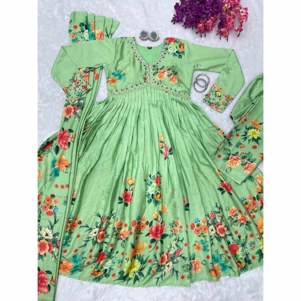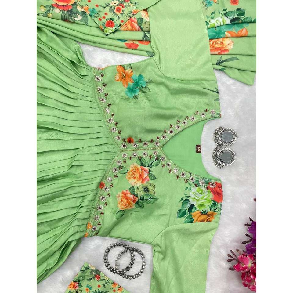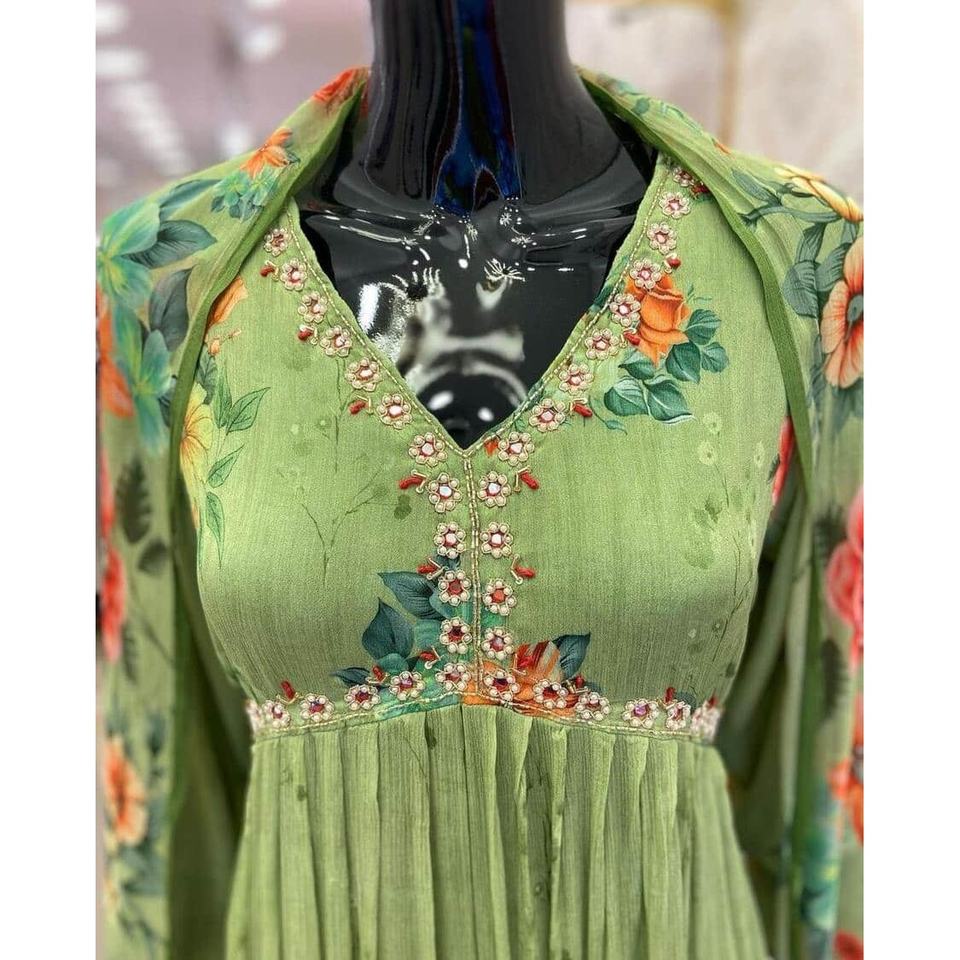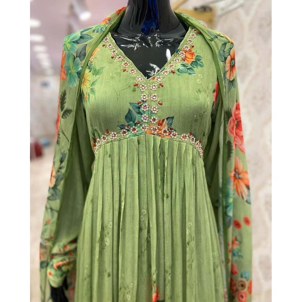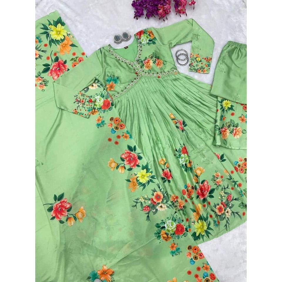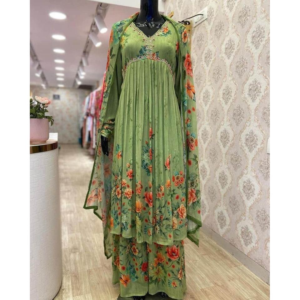 กางเกงผ้าชิออนดีไซน์เนอร์ตัดด้วยมือพร้อมพิมพ์ลายอาเลียพร้อมสีเขียวน้ำทะเล dupatta