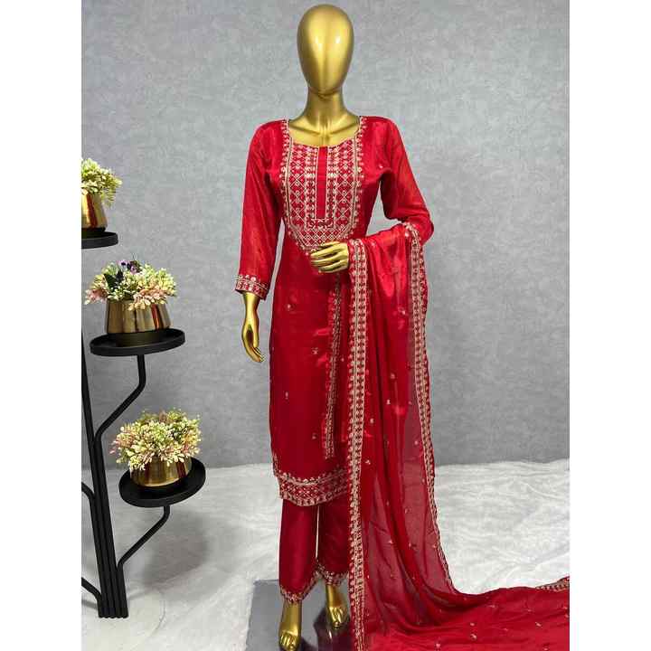 DESIGNER CHINON SILK EMBROIDERY SEQUENCE THREAD WORK TOP BOTTOM WITH DUPATTA RED