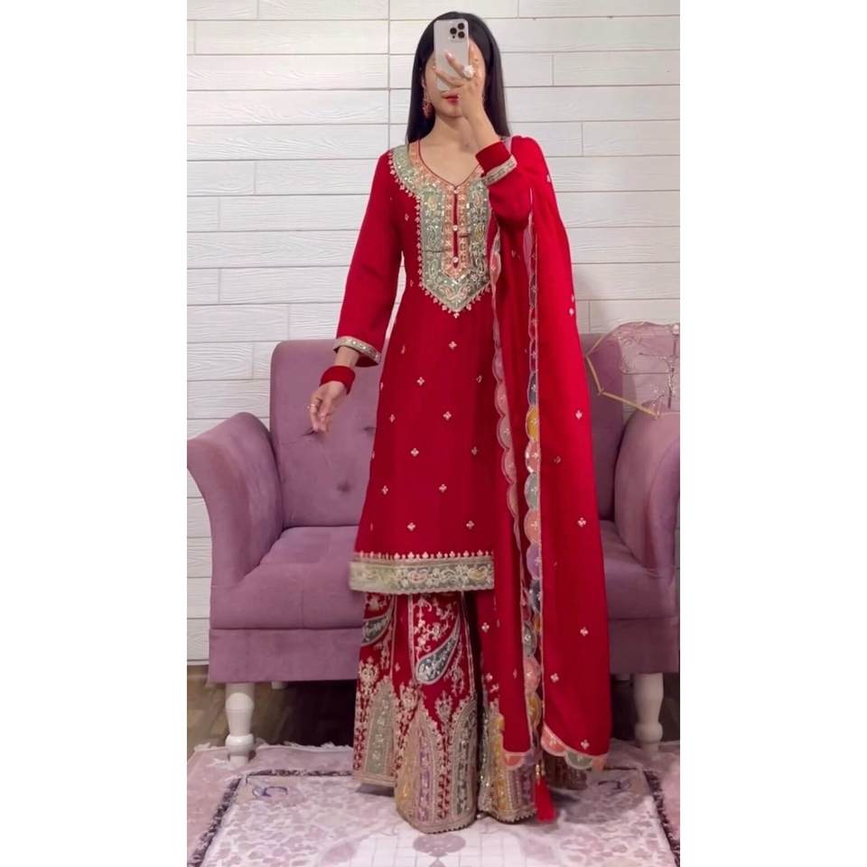 เสื้อปักลายดีไซเนอร์ด้วยด้ายชิโนน พร้อมกางเกงปาลาซโซ่และผ้าคลุมไหล่สีแดง