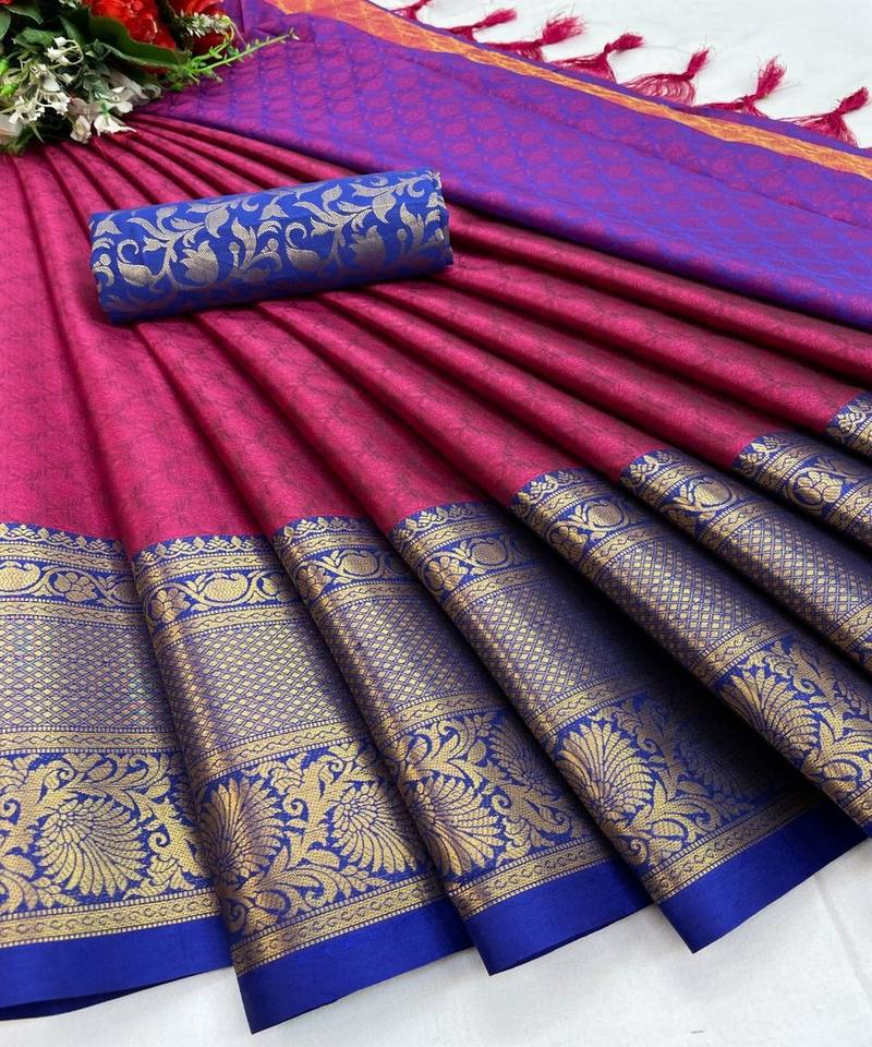 ชุดส่าหรีผ้าฝ้ายผสมแจ็คการ์ดขอบผ้าไหมดีไซน์เนอร์เสื้อเบลาส์เนื้อผ้าผสมตะเข็บสีชมพูเข้ม