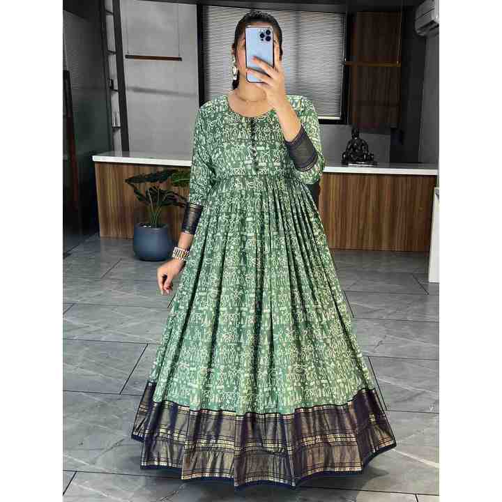 ชุดราตรีผ้าไหมพิมพ์ลาย kalamkari ทำจากผ้าฝ้ายสีเขียวดีไซเนอร์