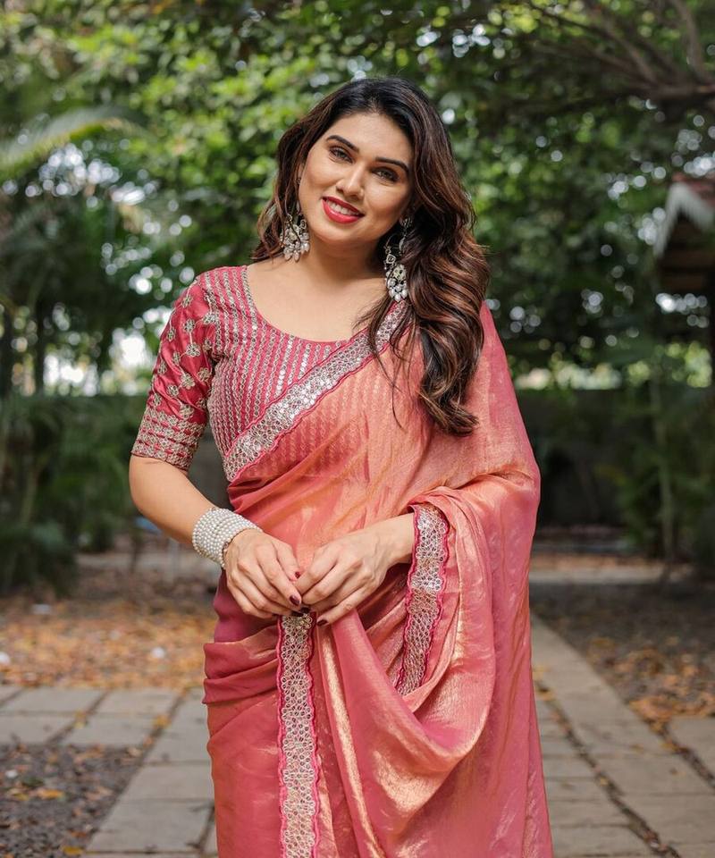 ชุดผ้าชีฟองสำหรับงานส่าหรีผ้าลูกไม้แต่งระบายชุดงานปาร์ตี้สีชมพู