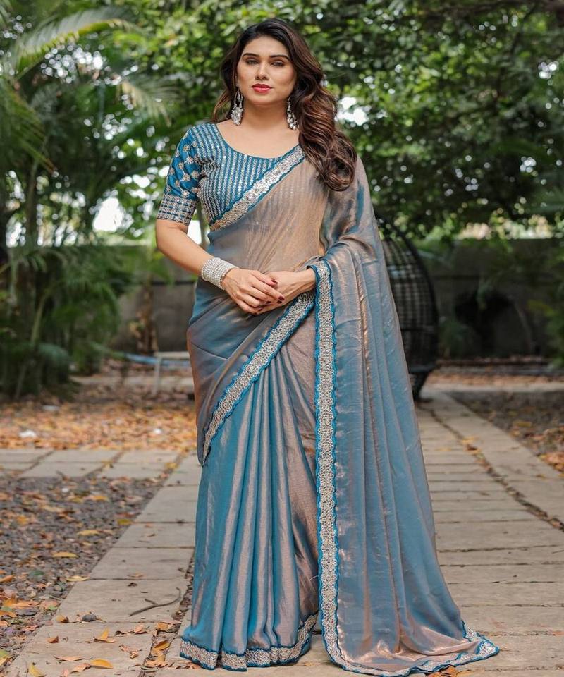 ผ้าส่าหรีผ้าฝ้ายผสมผ้าชีฟองลายลูกไม้ปักเลื่อมสไตล์โมเดิร์น ดีไซน์เนอร์ FENDY พร้อมเสื้อเบลาส์แบบยังไม่เย็บติดกับผ้าส่าหรี สำหรับงานปาร์ตี้ หลายสี ชุดพื้นเมือง
