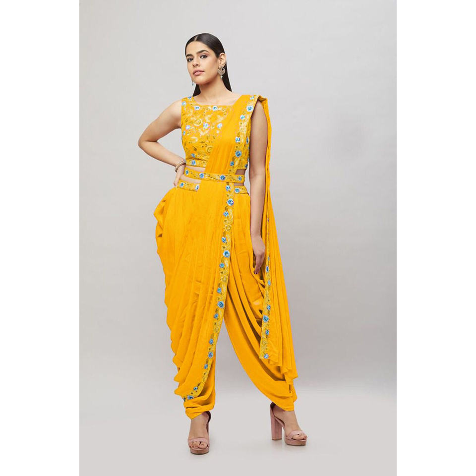 DESIGNER GEORGETTE EMBROIDERY WORK SAREE STYLE DHOTI BLOUSE with DUPATTA YELLOW