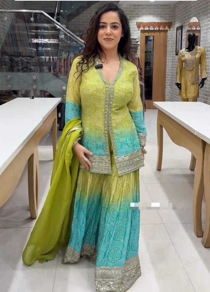 ชุดคุर्ตา/คุर्ติ ผ้าจอร์เจตต์ แต่งลายปักขอบ พร้อมผ้าคลุมไหล่ สีเขียว สำหรับงานแต่งงาน ผู้ใหญ่
