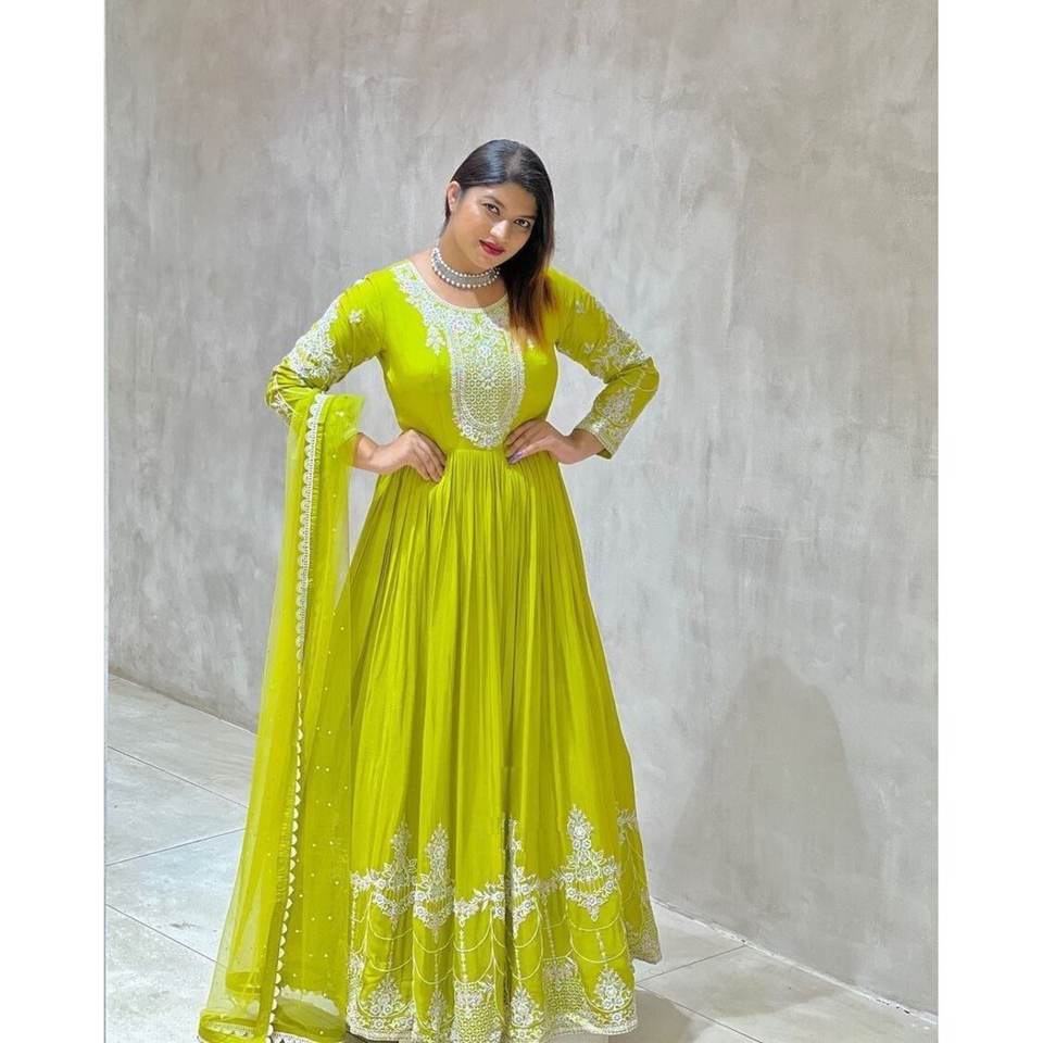 ชุดเดรสปักลายดีไซเนอร์ จอร์เจตต์ ซีเควนซ์ พร้อมผ้าคลุมไหล่สีเลมอน