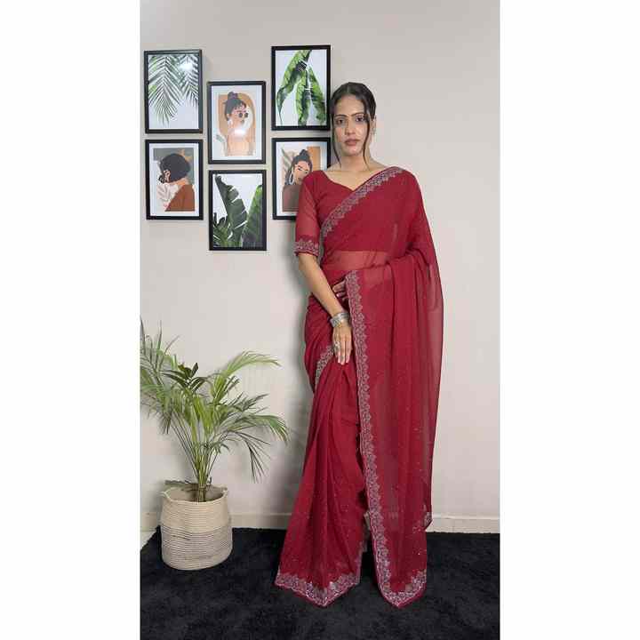 Georgette Swarovski ดีไซเนอร์พร้อมใส่ Saree กับเสื้อ unstitched สีแดง