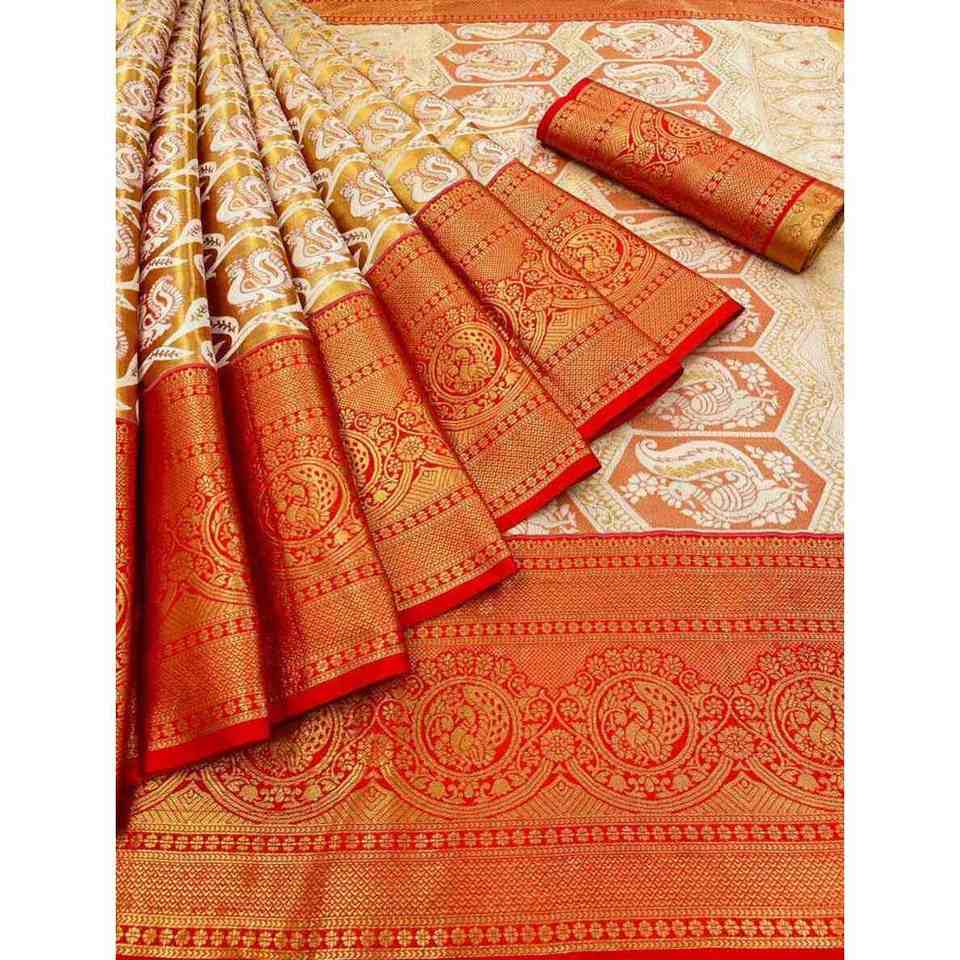 ผ้าส่าหรีใส่ทำงานผ้าไหมสีทองผ้า zari พร้อมเสื้อ unstitched สีส้มจากนักออกแบบ
