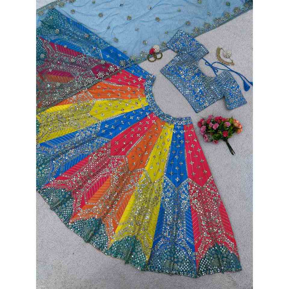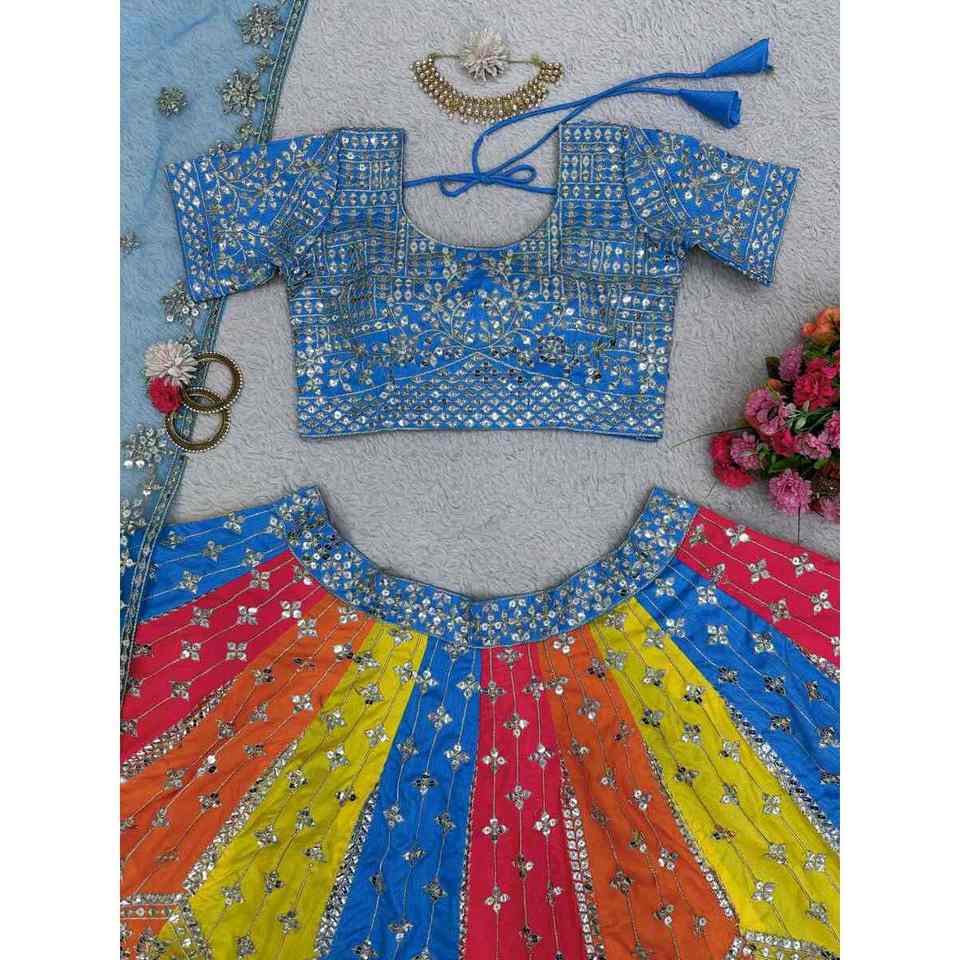 ดีไซเนอร์ MONO phentom silkprinted Jari sequence ทำงาน lehenga choli กับท้องฟ้า dupatta