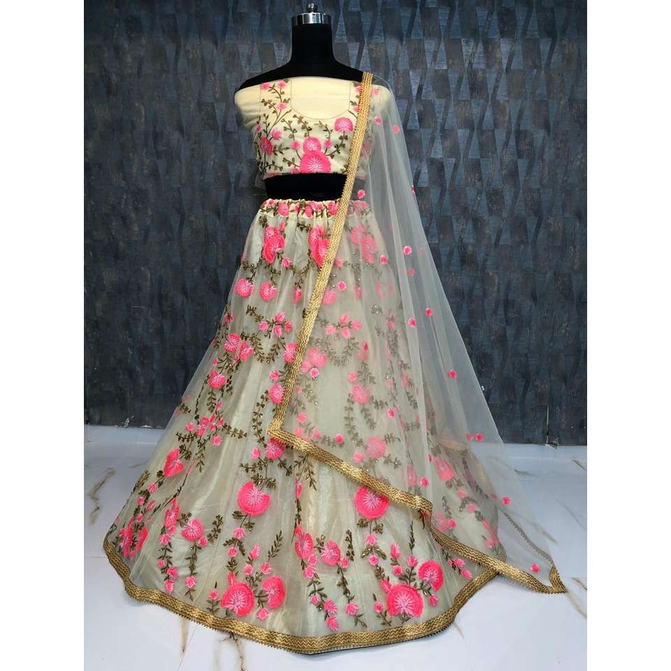 งานเย็บปักถักร้อยด้วยด้ายตาข่ายออกแบบโดยนักออกแบบ lehenga choli กับ dupatta สีขาว