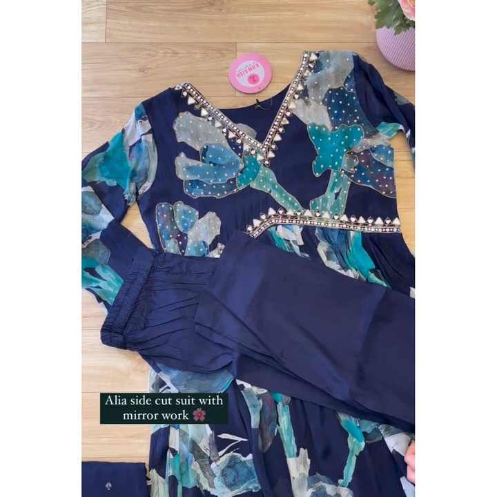 กระจกงานปักลายพิมพ์ดิจิตอลผ้าโปร่งบางดีไซน์เนอร์ตัดด้านล่างพร้อมสีฟ้าสดใส