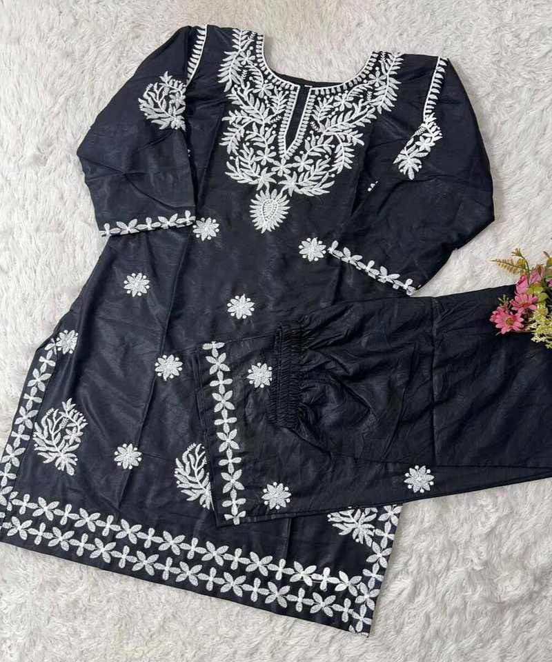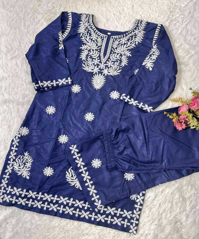 Rayon chikankari ชุดทำงาน kurti Palazzo ชุดสำหรับเทศกาลเสื้อผ้าพื้นเมืองระบายอากาศใส่สบายๆสีฟ้า