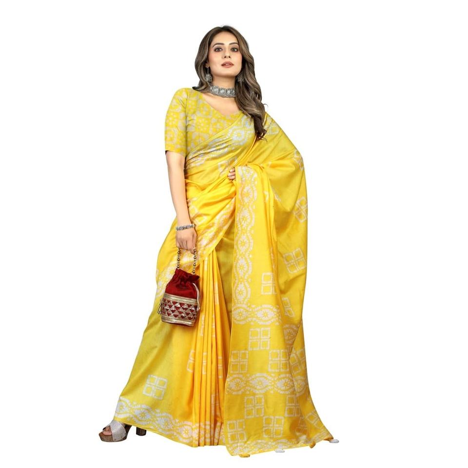 ผ้าส่าหรีผ้าฝ้ายเนื้อนุ่มพิมพ์ลายผ้าบาติกสีเหลืองดีไซน์เนอร์