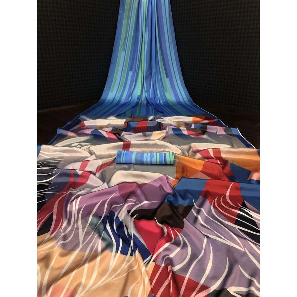 ผ้าโสร่งพิมพ์ลายดิจิตัลเอฟเฟกต์4D ผ้าไหมเนื้อนุ่มพร้อมเสื้อสีน้ำเงิน