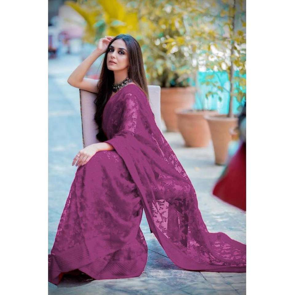 ผ้าส่าหรีงานปักลายซุปเปอร์เน็ตดีไซเนอร์ พร้อมเสื้อปักแบบยังไม่เย็บติด สีม่วง