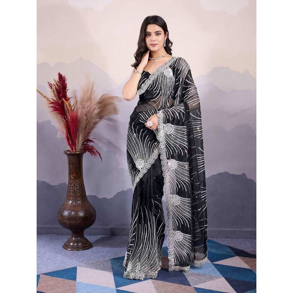 ผ้าลายทแยงปักตาข่ายสีดำสำหรับงานส่าหรีดีไซเนอร์
