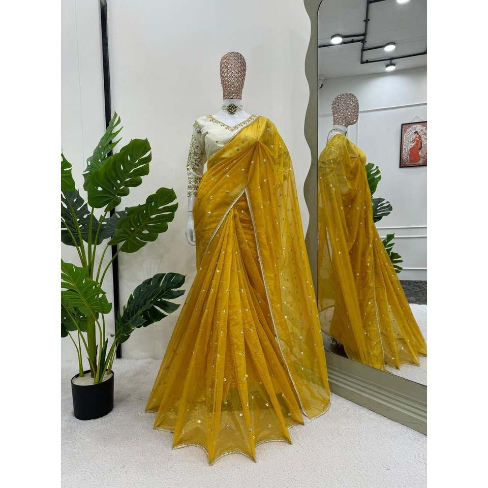 ผ้าส่าหรีผ้าตาข่ายเย็บติดเสื้อสีเหลืองผ้าลายทแยงดีไซน์เนอร์