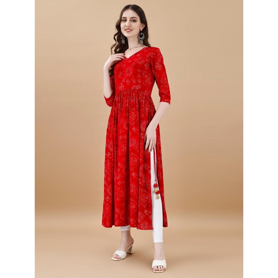 ดีไซน์เนอร์พิมพ์ badhni ด้วยมือทำจากลากันทำงาน nayra ตัด kurti สีแดง