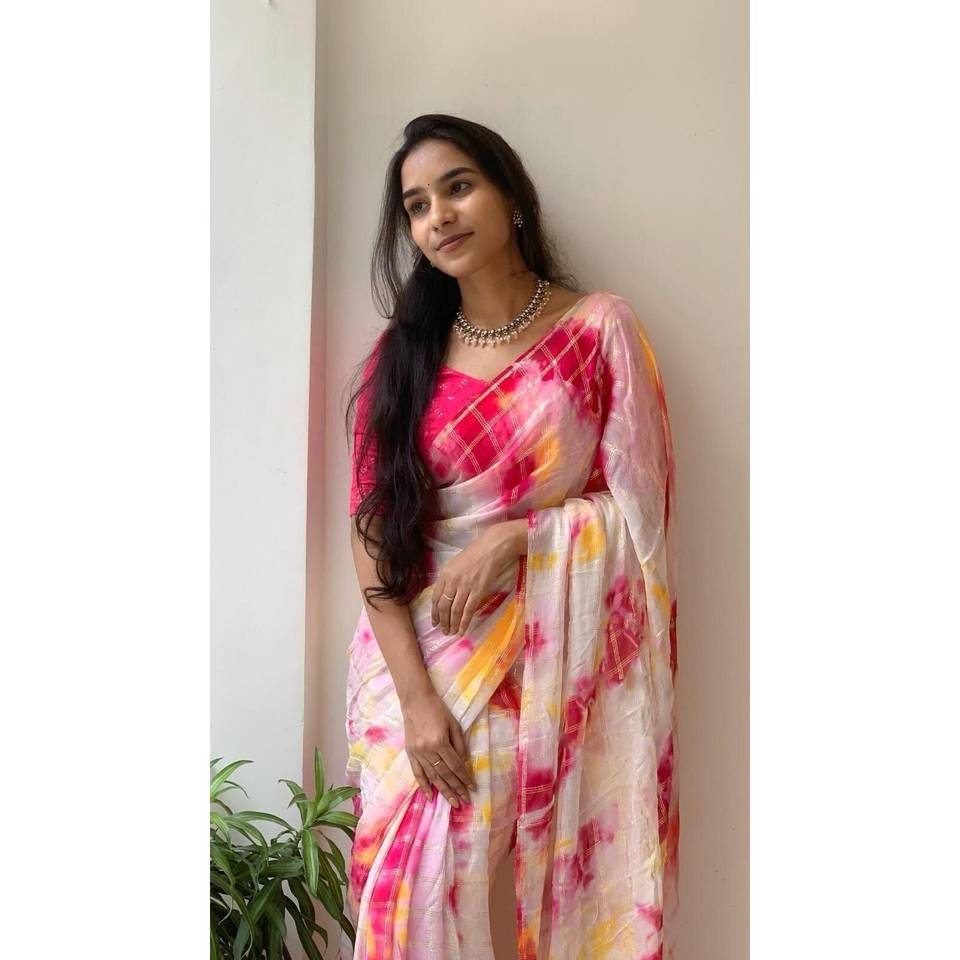 ผ้าซารีวิสโคสจอร์เจตต์ลายชิโบริย้อมมือพร้อมเสื้อปักสีชมพู