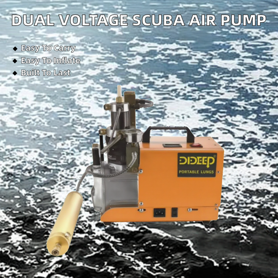 ปั๊มลมดำน้ำแบบพกพา DIDEEP 110V 220V แรงดันไฟฟ้าคู่ โครงเหล็ก ใช้ได้กับทุกฤดู ระบบหยุดอัตโนมัติและโหมดควบคุมด้วยมือ ปลั๊กแบบ US EU