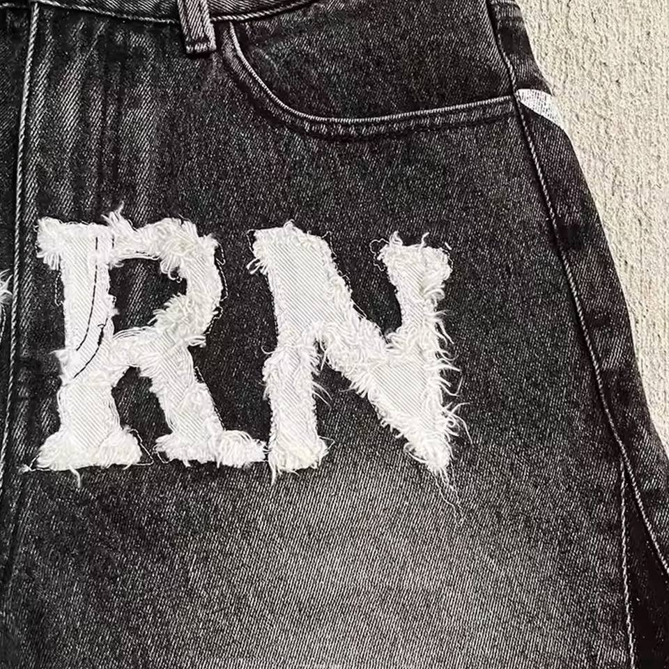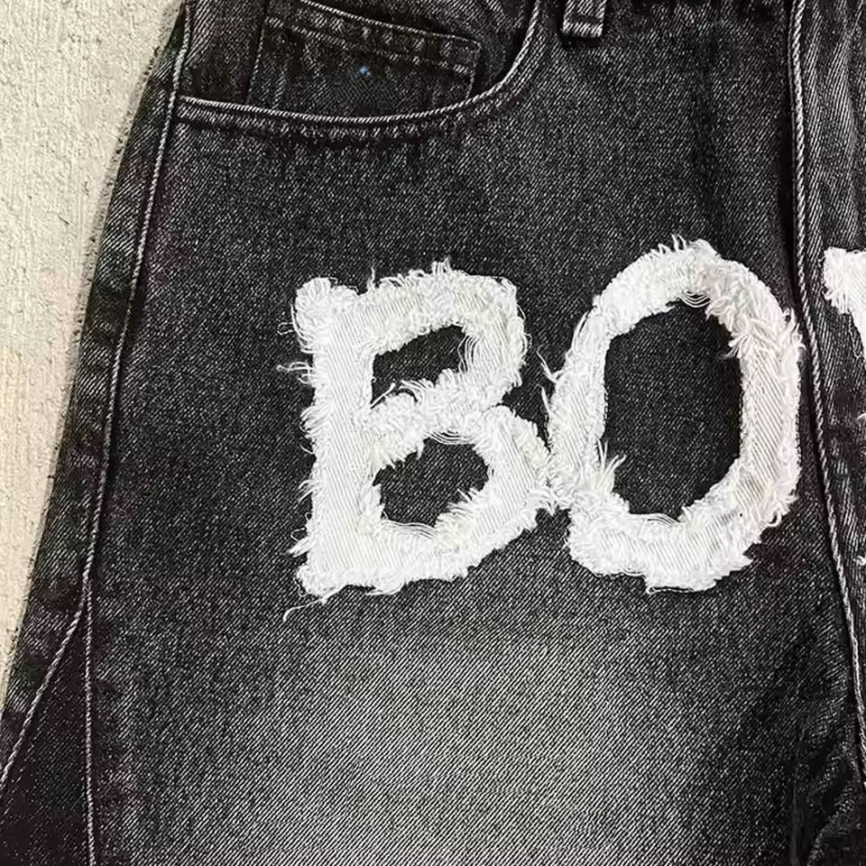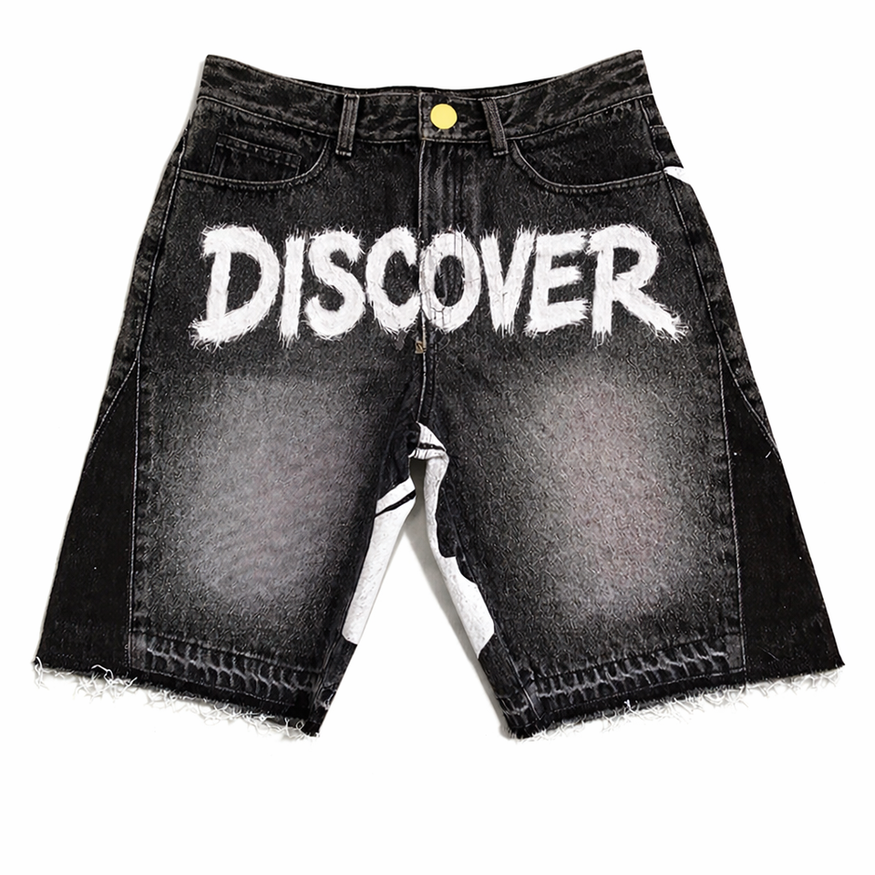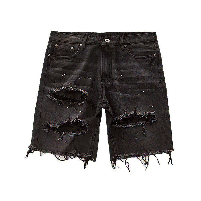 DISCOVER-IMPEX 2026 Men Black Distressed Denim Shorts with Letter Print Casual Streetwear Summer Jean Short