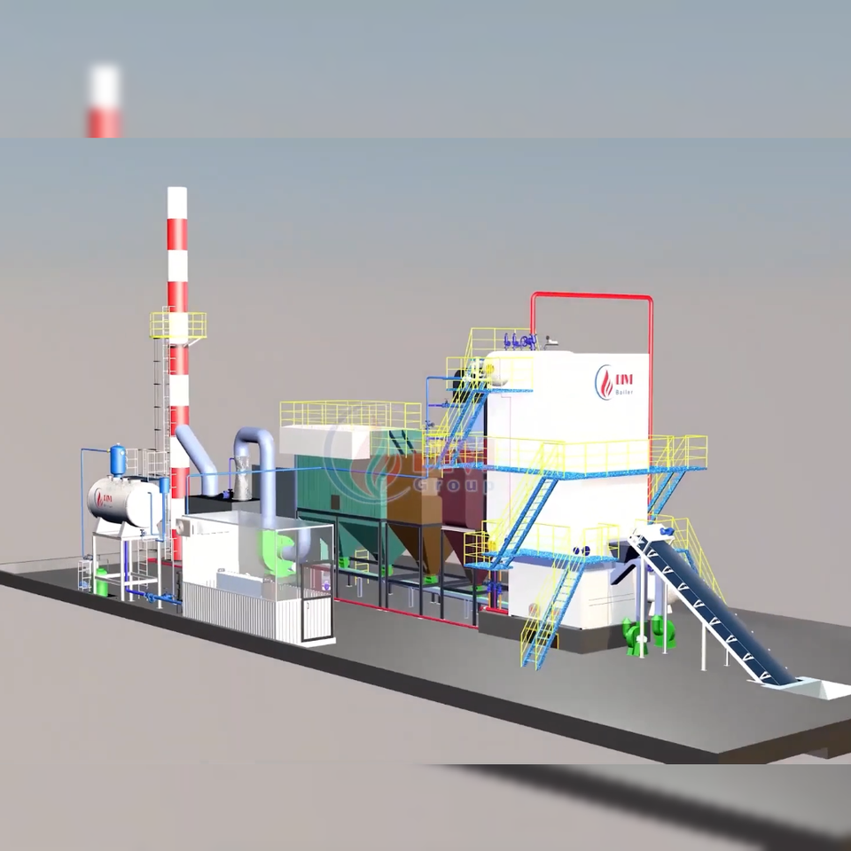 หม้อไอน้ำชีวมวลอุตสาหกรรมแนวตั้งประสิทธิภาพสูงของกลุ่มบริษัท DIVI แบบเตาเผาแบบฟลูอิไดซ์เบด ท่อน้ำแบบดรัมคู่ ใช้เชื้อเพลิงได้หลายชนิด ขนาด 215 ตัน