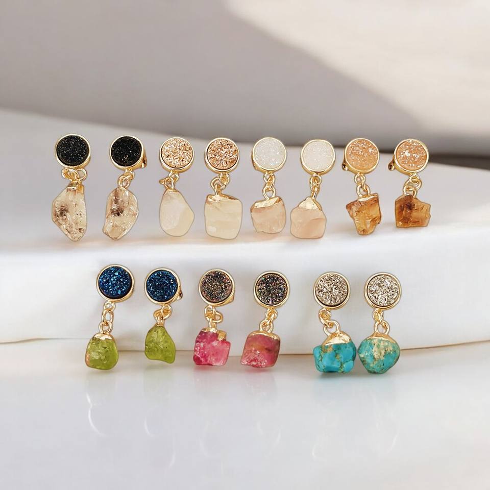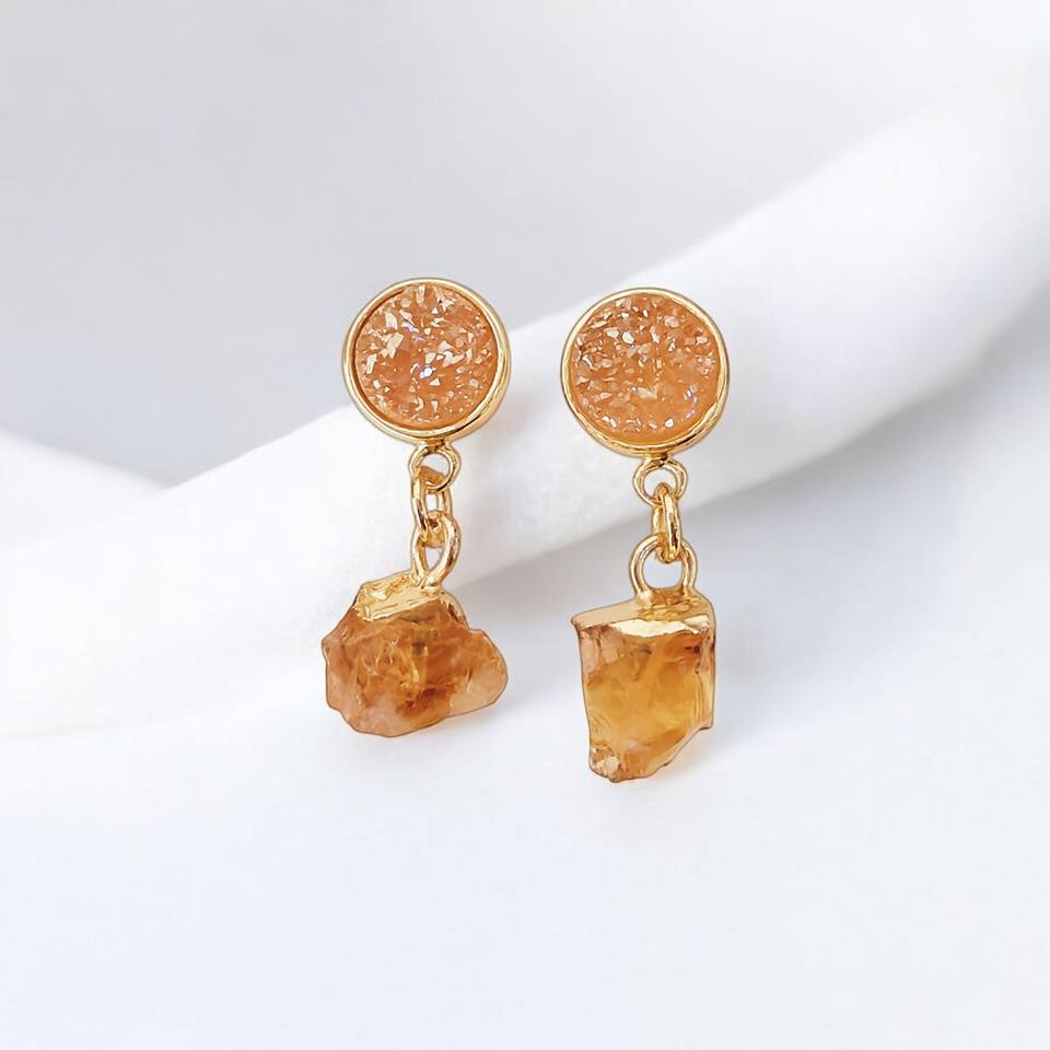 อัญมณีดรูซี่และซิทรีนแบบทำมือพร้อมต่างหูหยดน้ำหินดิบ-ต่างหูทำมือเสน่ห์เครื่องประดับต่างหู