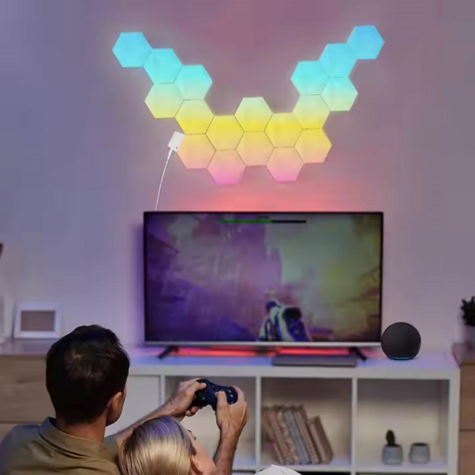 ไฟบรรยากาศรูปหกเหลี่ยม DIY สำหรับตกแต่งภายใน RGB แผงไฟ LED รูปทรงรังผึ้ง สำหรับเล่นเกม
