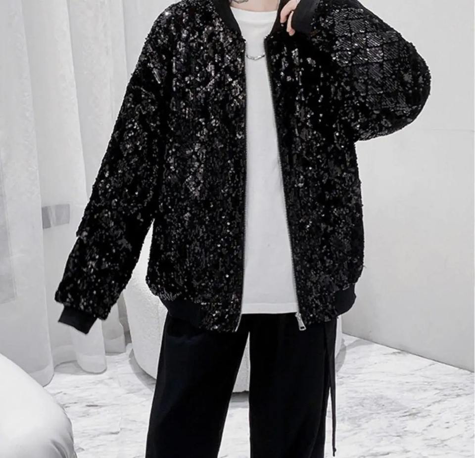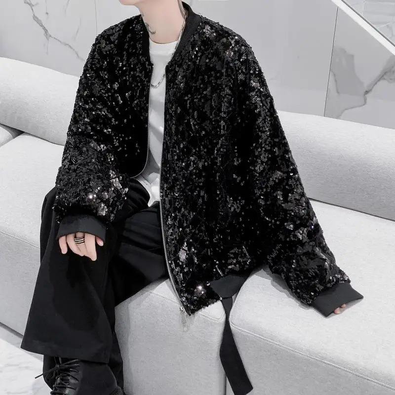 DJ SINGER เสื้อแจ็กเก็ตหนังแท้สำหรับผู้ชาย, เสื้อแจ็กเก็ตผ้าแคนวาสแฟชั่นแวววาวทรงหลวมมีซิปด้านหน้าแขนยาว