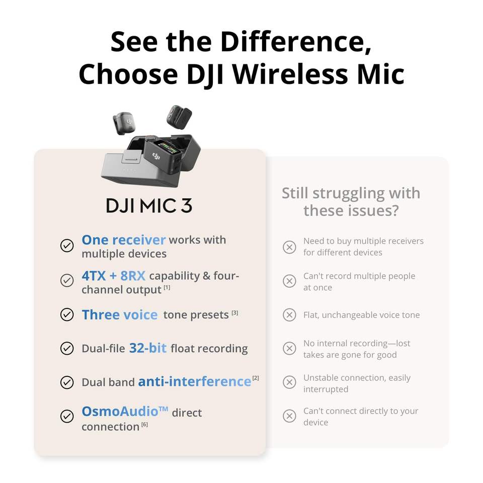 ไมโครโฟนไร้สาย DJI Mic 3 1 TX + 1 RX ระบบตัดเสียงรบกวนสองระดับ สำหรับสมาร์ทโฟน กล้องถ่ายรูป พอดแคสต์ วิดีโอบล็อก