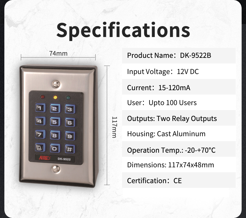 DK-9522B ชุดควบคุมการเข้าออกด้วยแป้นกดดิจิตอลขั้นสูง 12V รองรับผู้ใช้ 100 คน พร้อมเซ็นเซอร์ประตู และรีโมทควบคุมเอาต์พุต