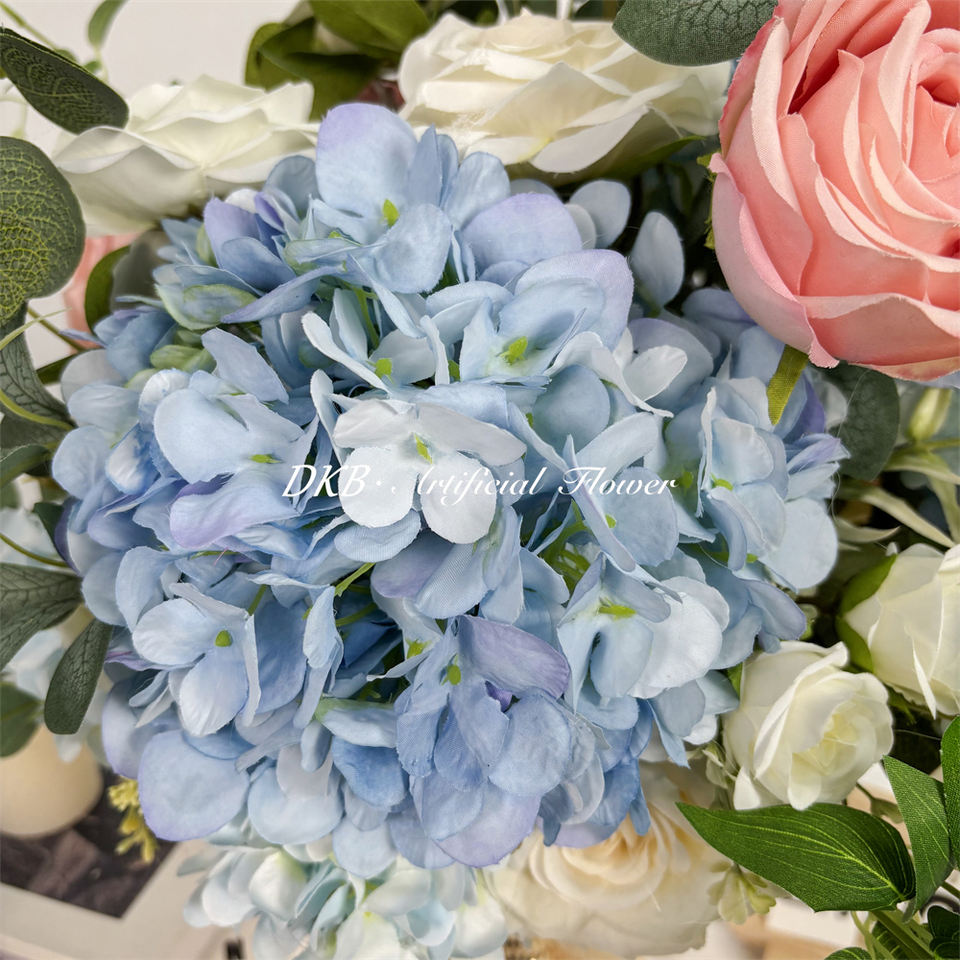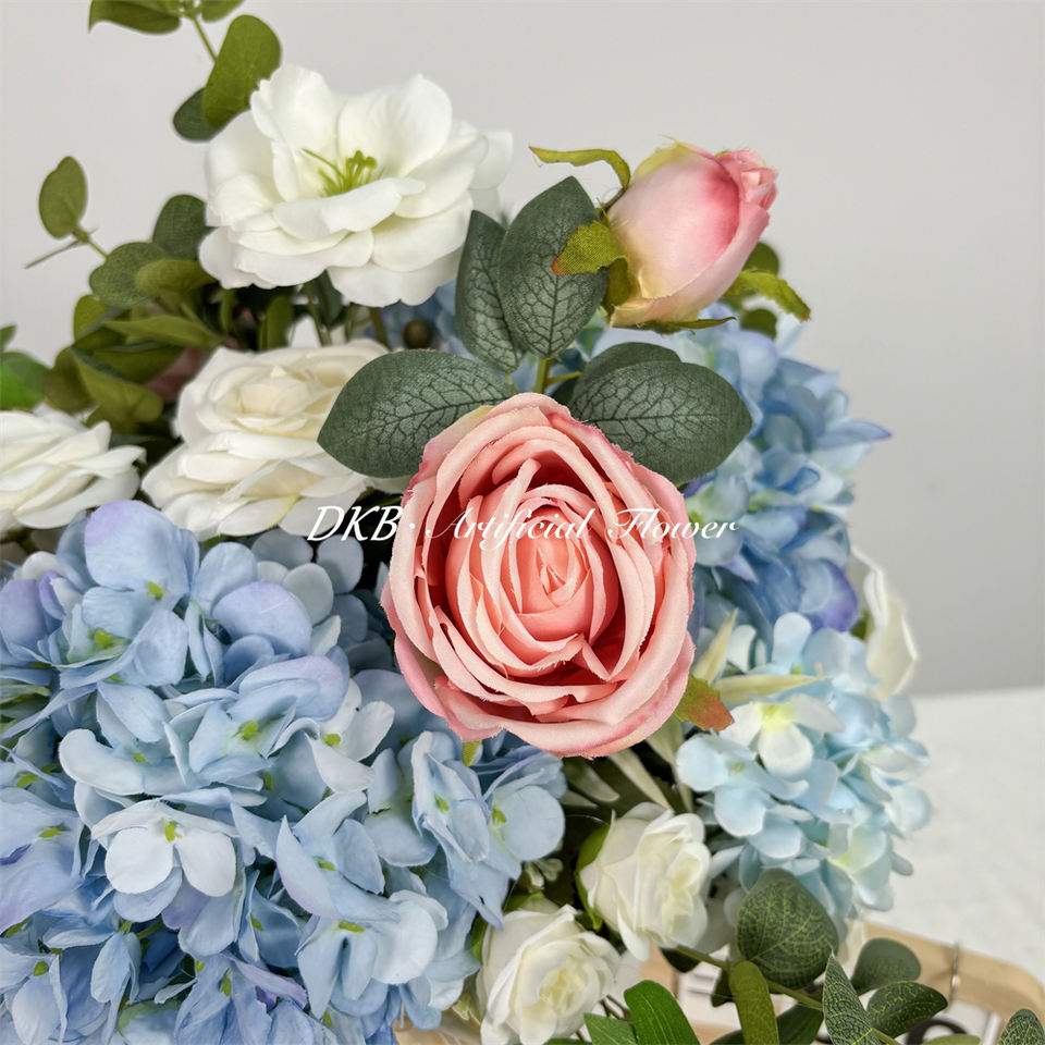 ดอกกุหลาบผ้าไหมเทียม DKB สีน้ำเงินรอยัลและสีขาว ตกแต่งโต๊ะงานแต่งงานสไตล์โมเดิร์น