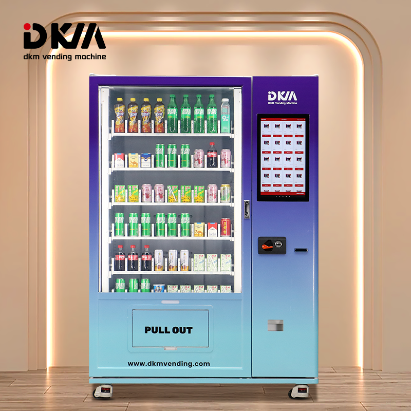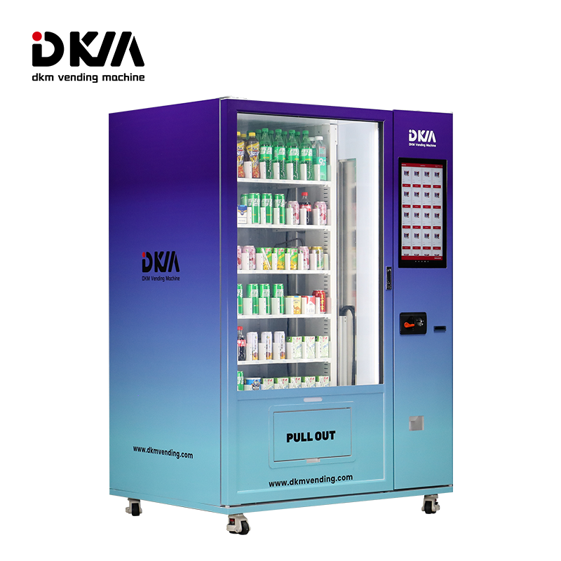 DKM OEM Cashless Touch Screen Glass Bottle Cans Freezer Vending Machine for Foods and Drinks with Elevator Lifting