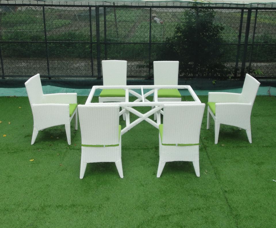 DL ชุดรับประทานอาหารกลางแจ้งที่ทันสมัยเฟอร์นิเจอร์ในสวนหวายพร้อมโต๊ะสี่เหลี่ยมกระจกนิรภัยและเก้าอี้6ตัวสำหรับโรงแรมและสวนสาธารณะ