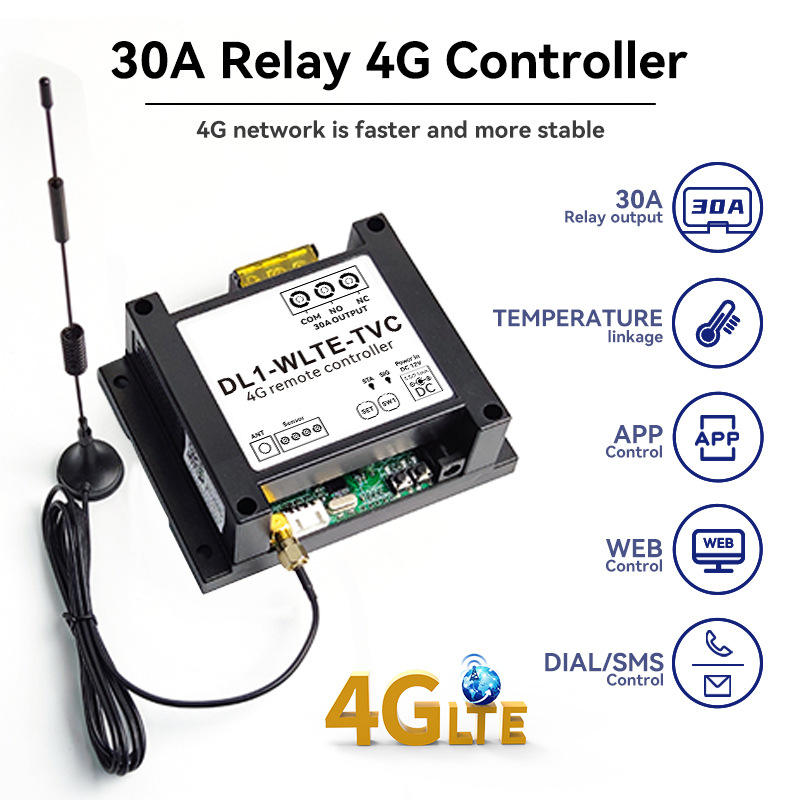 DL1-WLTE-T 4G 30A GSM 1 Channel เซ็นเซอร์อุณหภูมิ LTE สวิตช์ควบคุมรีเลย์2ตัวปิดการเตือนภัยซิมโทร SMS รีโมทคอนโทรล