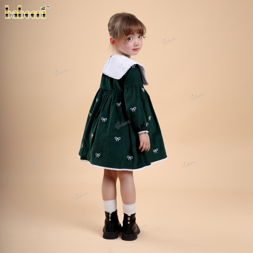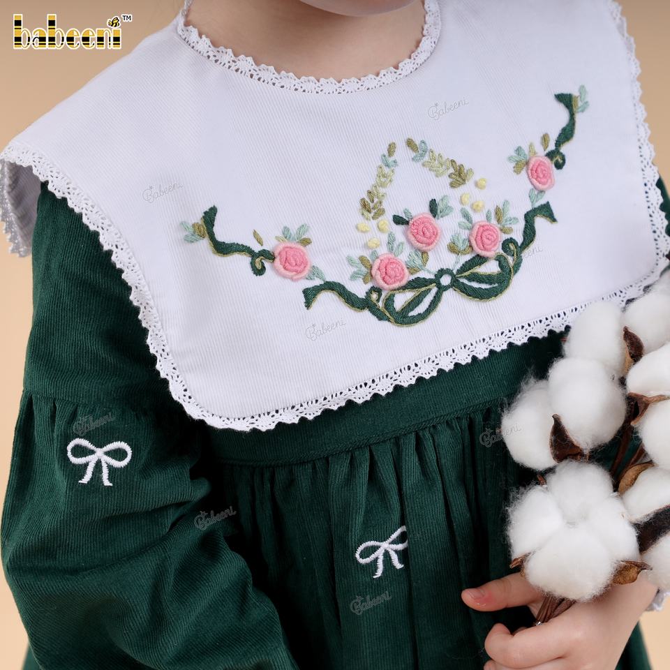 DR4498 Autumn Knee-Length Smocked Embroidered Corduroy A-Line Floral 100% Cotton Hand Smocked Dress for Baby Girls