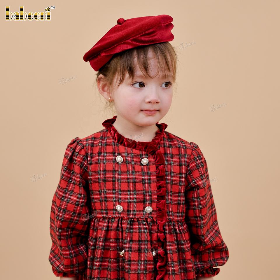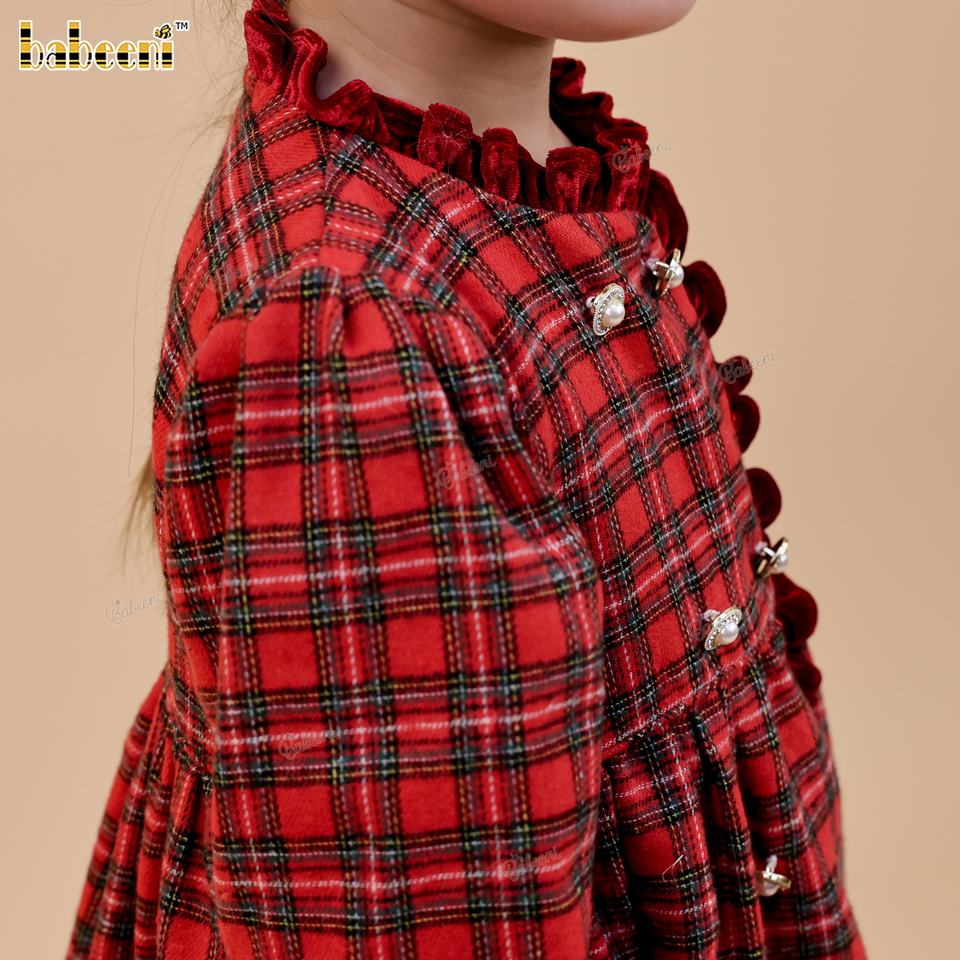 ชุดเดรสกำมะหยี่ลายสก็อตสีแดงสด DR4512 แขนกุด ความยาวปานกลาง ตกแต่งด้วยการเย็บมือ เสื้อผ้าเด็ก ฤดูใบไม้ร่วง ODM