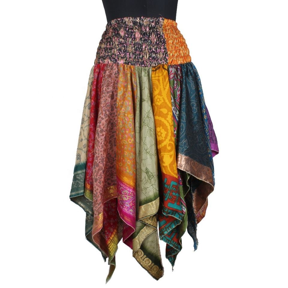 กระโปรง DS028สไตล์ชนเผ่าประดับเพชรสำหรับผู้หญิงกระโปรงงานเย็บปะติดเอวสูงทำจากผ้าไหมรีไซเคิลสำหรับใส่ในฤดูร้อน