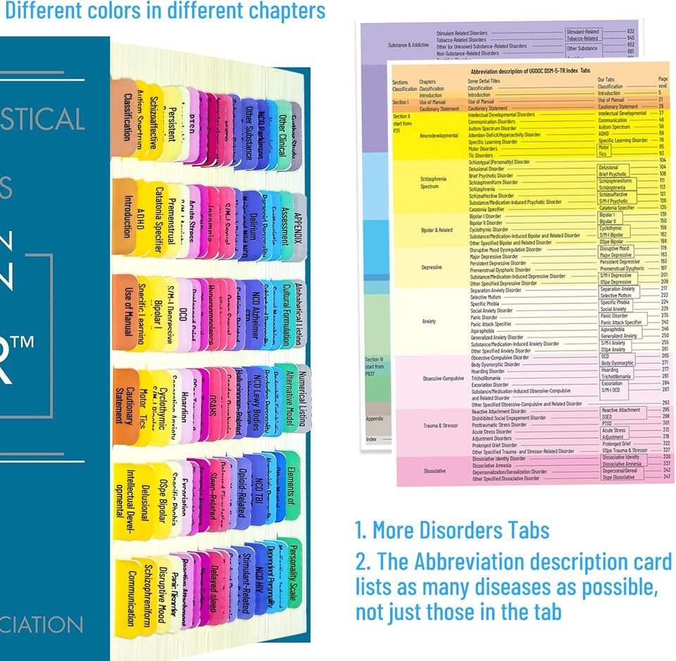 ชุดแท็บดัชนี DSM-5-TR พร้อมแท็บพิมพ์ 94 แท็บ แท็บเปล่า 18 แท็บ การ์ดจัดตำแหน่ง และการ์ดย่อคำ (ขายส่ง)