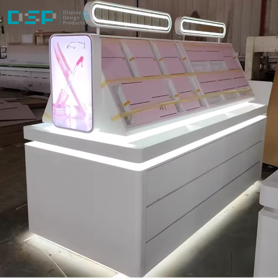 โรงงาน DSP เวียดนาม ผลิตภัณฑ์เคลือบสีเงาแบบอบสำหรับเครื่องสำอาง โลหะ อะคริลิก ไม้ ชั้นวางเครื่องสำอางแบบตั้งโต๊ะกลาง