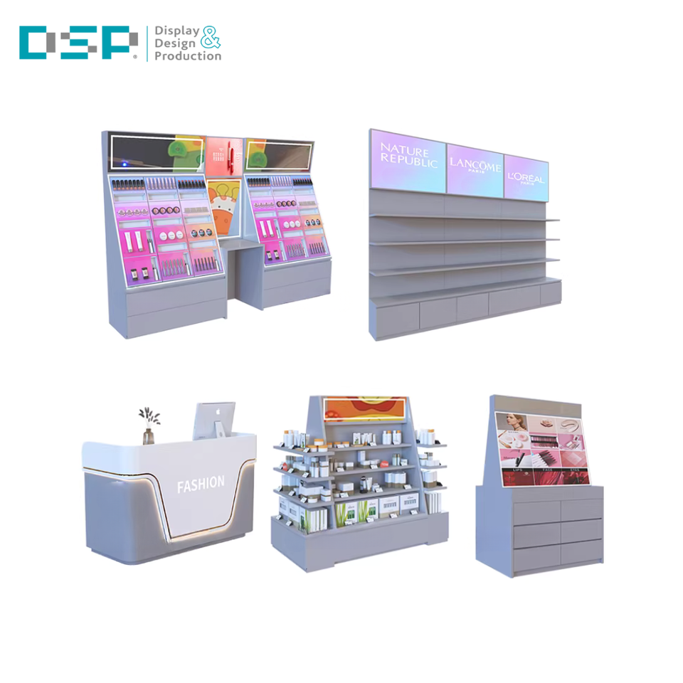 เคาน์เตอร์เครื่องสำอางไม้สีชมพูรูปวงรีเคลือบสีเงาแบบอบพร้อมไฟ LED สำหรับห้างสรรพสินค้า ผลิตโดยโรงงาน DSP เวียดนาม