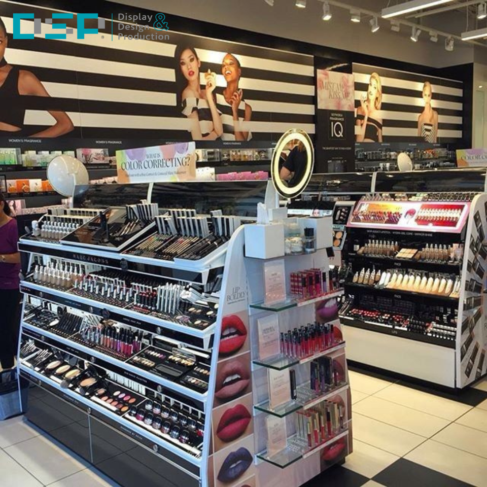 เคาน์เตอร์โชว์เครื่องสำอางเคลือบเงาแบบอบสีจากโรงงานเวียดนาม DSP ชั้นวางเครื่องสำอางไม้สำหรับร้านเสริมสวย