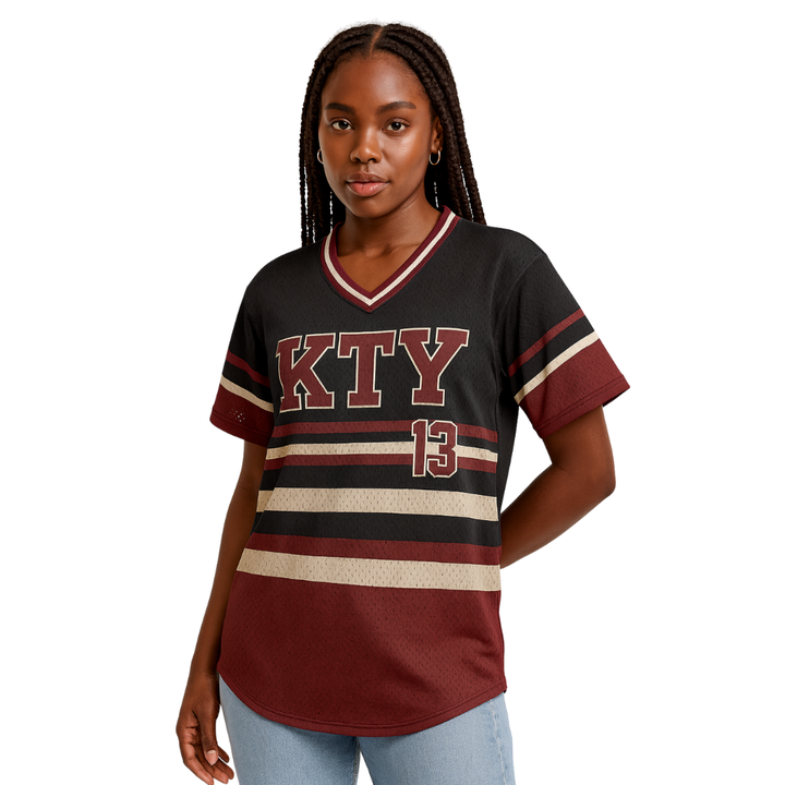 DST Black Striped Pullover Baseball Jersey 100% Polyester Mesh Delta Sorority Apparel V Neck T Shirt Maroon Embroidered Applique