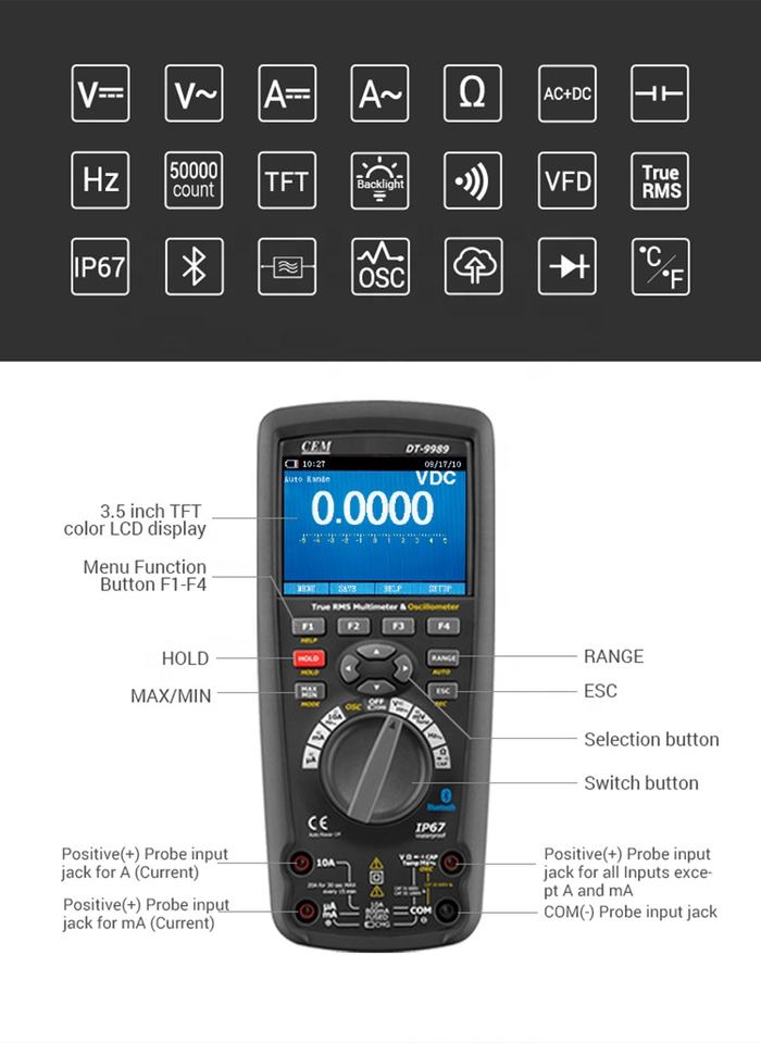 มัลติมิเตอร์ดิจิทัล DT-9989,เครื่องแสดงคลื่นกระแสไฟฟ้าหน้าจอสี LCD USB เครื่องมือทดสอบแรงดันไฟฟ้ากระแสไฟฟ้ามืออาชีพ