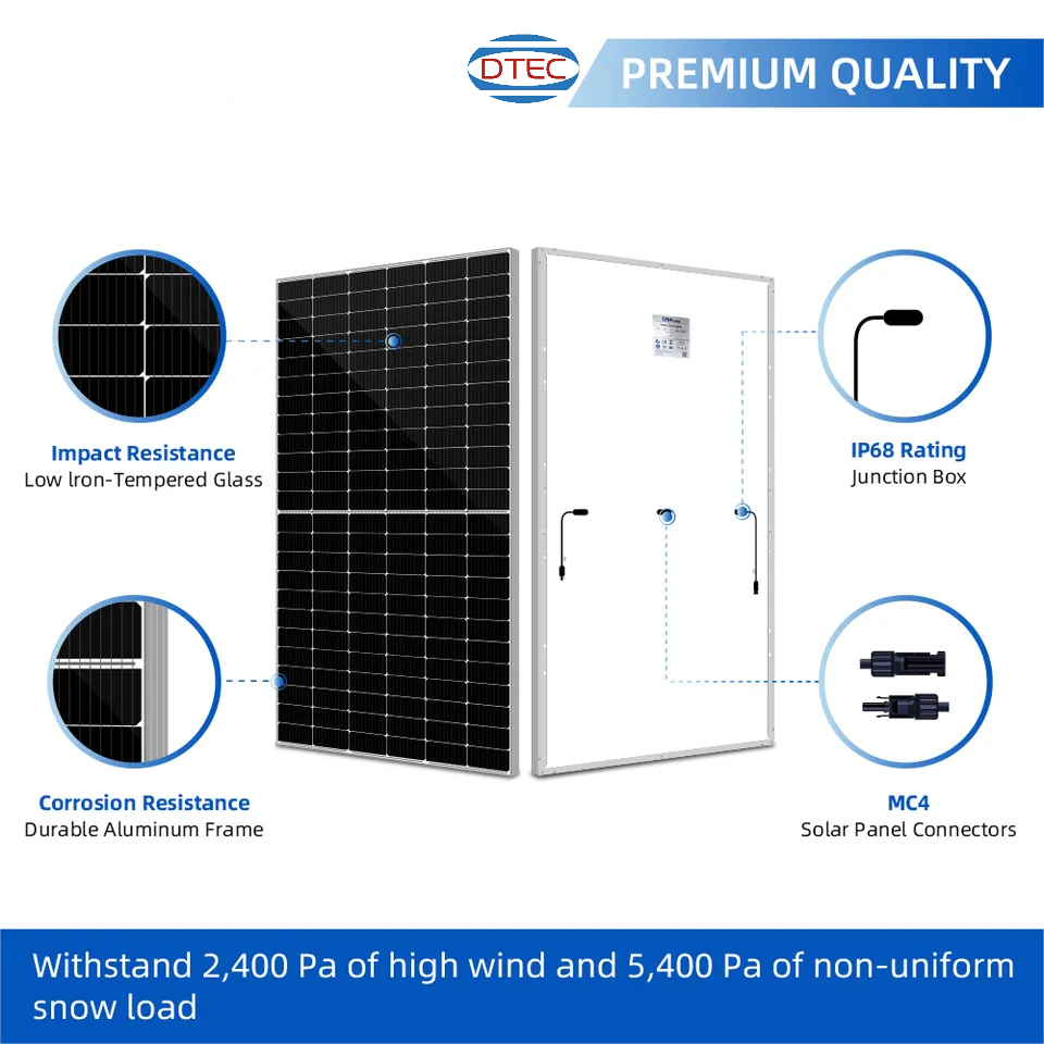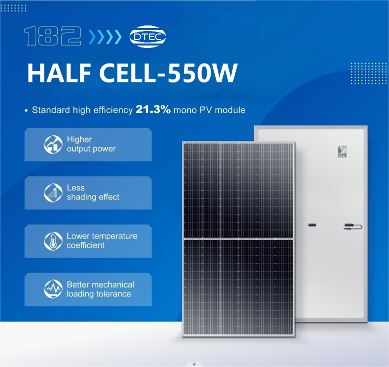 Dtec แผงโซลาร์เซลล์แบบครึ่งหน้า580 W 550 W แผงโซลาร์เซลล์แบบครึ่งหน้า182mm ชนิด N ยืดหยุ่น585 W 78TR biefacial 580 W 550 W O Point