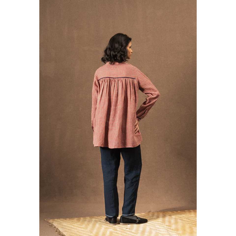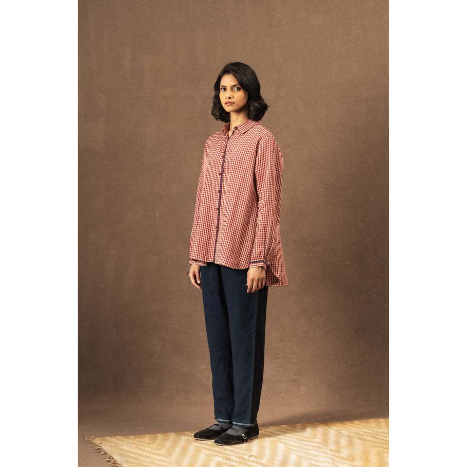 เสื้อเชิ้ตผ้าลินินทอมือ 100% ลายตารางสีแดงเข้ม DVE DEVESHI